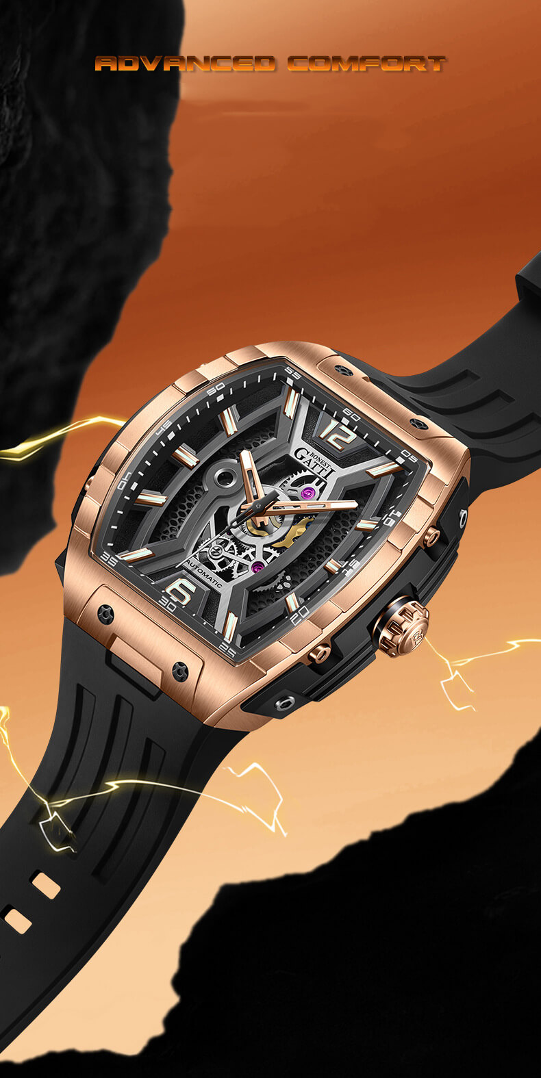 Đồng hồ Bonest Gatti BG5601 cũng có dây đeo bằng cao su chất lượng cao, êm ái và thoải mái khi đeo trong thời gian dài. Đồng hồ còn được trang bị bộ máy của Nhật Bản chính xác, đảm bảo độ chính xác và độ bền cao