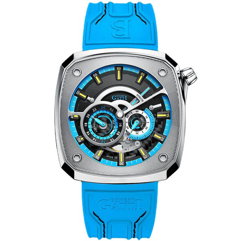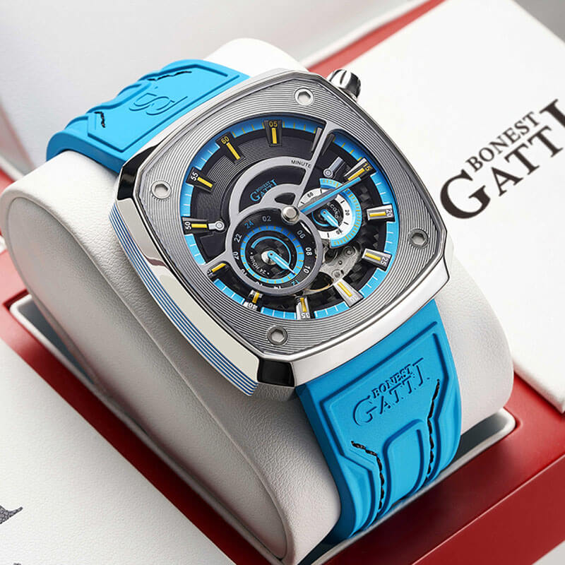 Thiết kế độc đáo của Bonest Gatti BG6601 là điểm nhấn chính của chiếc đồng hồ này. Mặt số trông rất phong cách và hiện đại, với các số chỉ giờ và cọc phút được cắt rãnh tinh tế, tạo nên một tổng thể hài hòa và ấn tượng. Bên cạnh đó, các bộ phận bên trong của máy móc đồng hồ cũng được hiển thị rõ ràng trên mặt số, cho phép người đeo có cái nhìn trực quan về cơ chế hoạt động của đồng hồ.