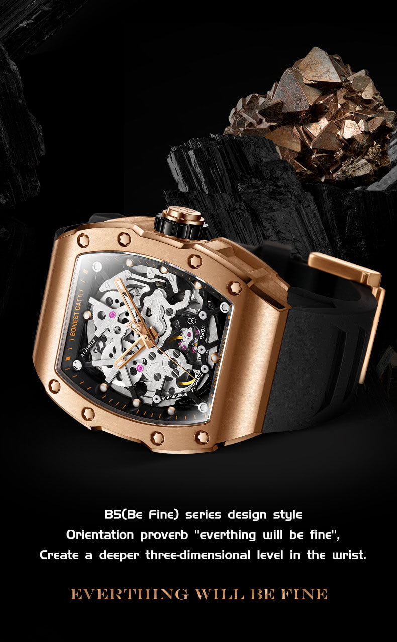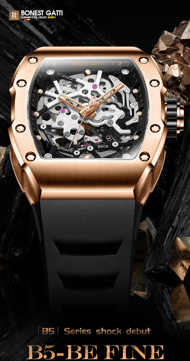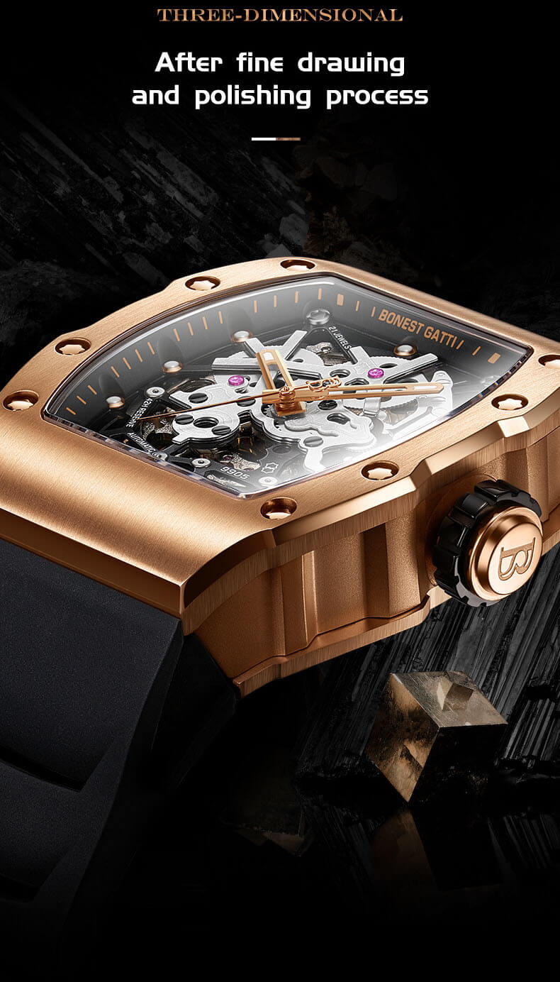 Điểm đặc biệt của Bonest Gatti Skeleton BG9905 là việc sử dụng các vật liệu cao cấp trong thiết kế. Vỏ đồng hồ được làm từ thép không gỉ chất lượng cao, mang lại độ bền và độ chống nước tốt. Dây đeo cao su cực kỳ bền theo thời gian, tôn lên vẻ sang trọng và đẳng cấp của chiếc đồng hồ