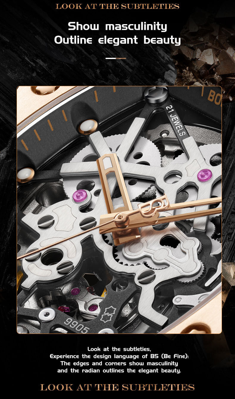 Thiết kế độc đáo của Bonest Gatti Skeleton BG9905 là điểm nhấn chính của chiếc đồng hồ này. Mặt số trông rất phong cách và hiện đại, với các số chỉ giờ và cọc phút được cắt rãnh tinh tế, tạo nên một tổng thể hài hòa và ấn tượng. Bên cạnh đó, các bộ phận bên trong của máy móc đồng hồ cũng được hiển thị rõ ràng trên mặt số, cho phép người đeo có cái nhìn trực quan về cơ chế hoạt động của đồng hồ.