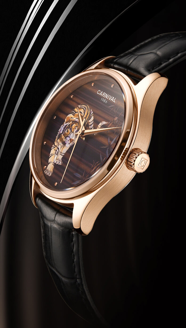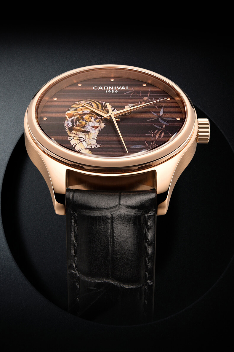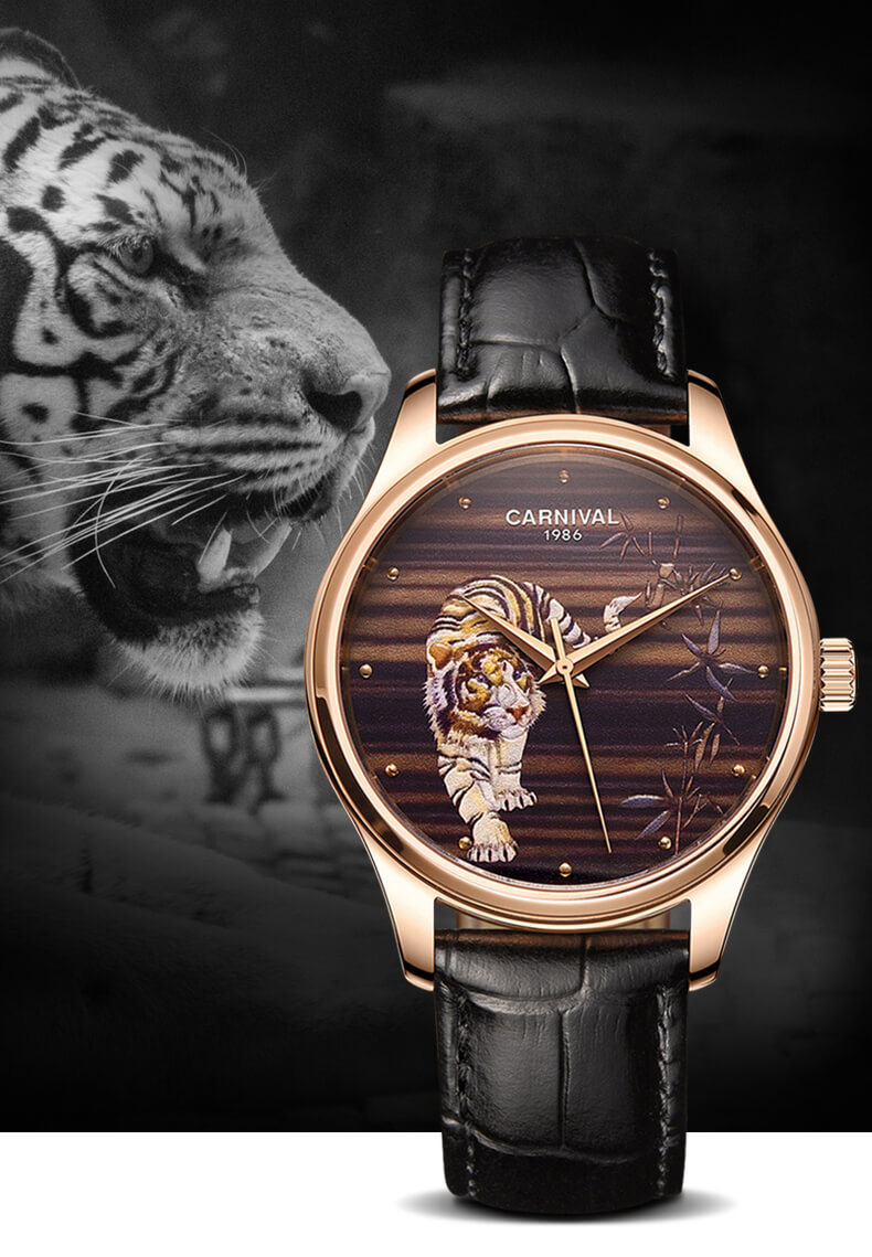 Đồng hồ Carnival C515G-3 chạm khắc hổ vàng sang trọng đẳng cấp cho quý ông. Hổ là loài vật linh thiêng và đầy uy quyền thường được thờ phụng, chính vì thế hổ là biểu tượng cho quyền lực, cho công danh học hành và sự tăng tiến trong kinh doanh. Là vật khí của công danh, tài lộc và quyền lực. Mang nguyên khí Kim là cát khí đem lại sự may mắn về công danh, tài lộc, học hành thi cử. Cũng có thể dùng để trấn yểm khi nhà bị phạm vào cấm lỵ hoặc bị Sát tinh chiếu hướng.