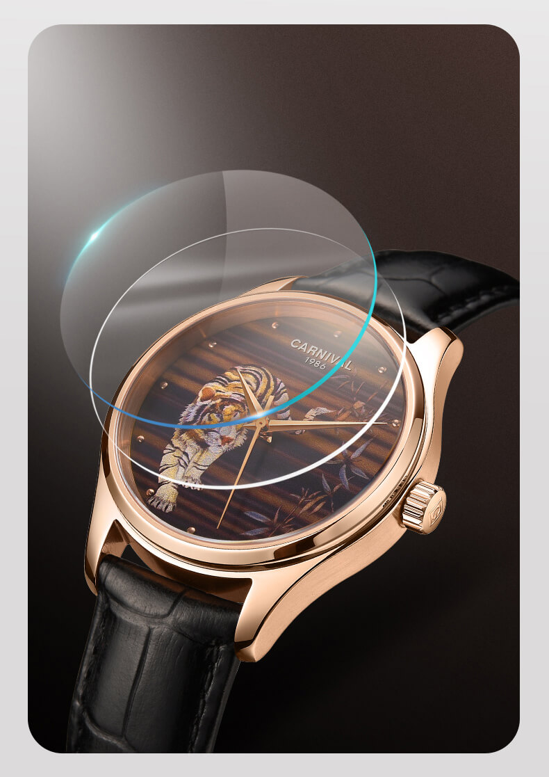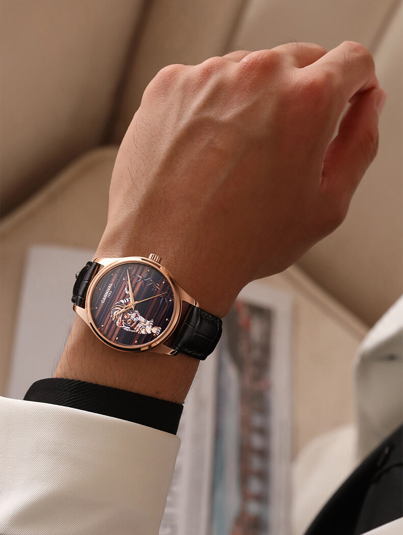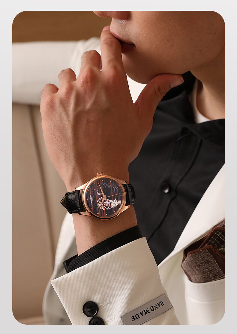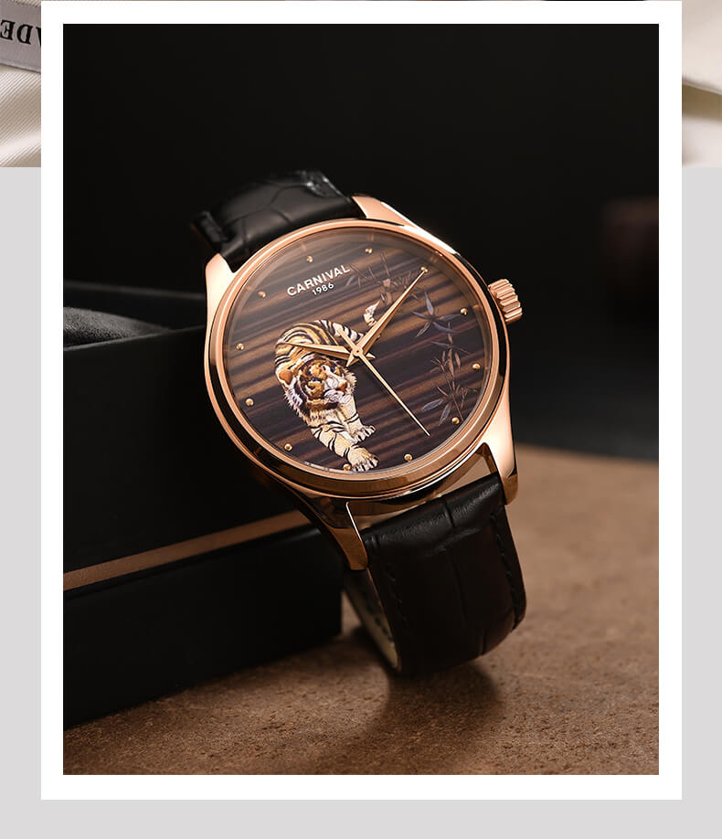 Đồng hồ Carnival C515G-3 chạm khắc hổ vàng sang trọng đẳng cấp cho quý ông. Hổ là loài vật linh thiêng và đầy uy quyền thường được thờ phụng, chính vì thế hổ là biểu tượng cho quyền lực, cho công danh học hành và sự tăng tiến trong kinh doanh. Là vật khí của công danh, tài lộc và quyền lực. Mang nguyên khí Kim là cát khí đem lại sự may mắn về công danh, tài lộc, học hành thi cử. Cũng có thể dùng để trấn yểm khi nhà bị phạm vào cấm lỵ hoặc bị Sát tinh chiếu hướng.