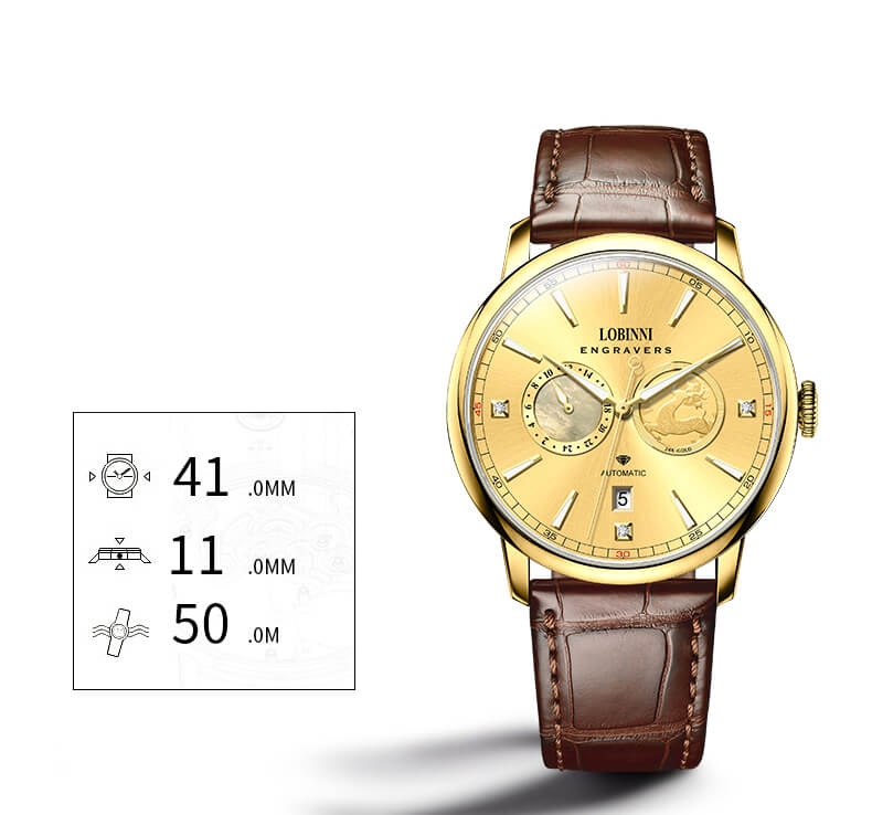 Đồng hồ Moonphase được coi là một trong những biểu tượng thanh lịch của ngành công nghiệp đồng hồ. Lobinni đã kết hợp hơn 60 năm kinh nghiệp sản xuất đồng hồ và bàn tay khéo léo, tỉ mỉ của những người thợ lành nghề Thụy Sỹ, cho ra đời chiếc đồng hồ Lobinni L3603-1 Moonphase. Moonphase là một trong những tính năng phức tạp nhất trong chế tác đồng hồ, yêu cầu sự tỉ mỉ và tính toán chi tiết. Bởi sự phức tạp này, chức năng moonphase (hay còn được gọi là lịch tuần trăng) thường chỉ xuất hiện trên những mẫu đồng hồ trung cấp tới cao cấp.